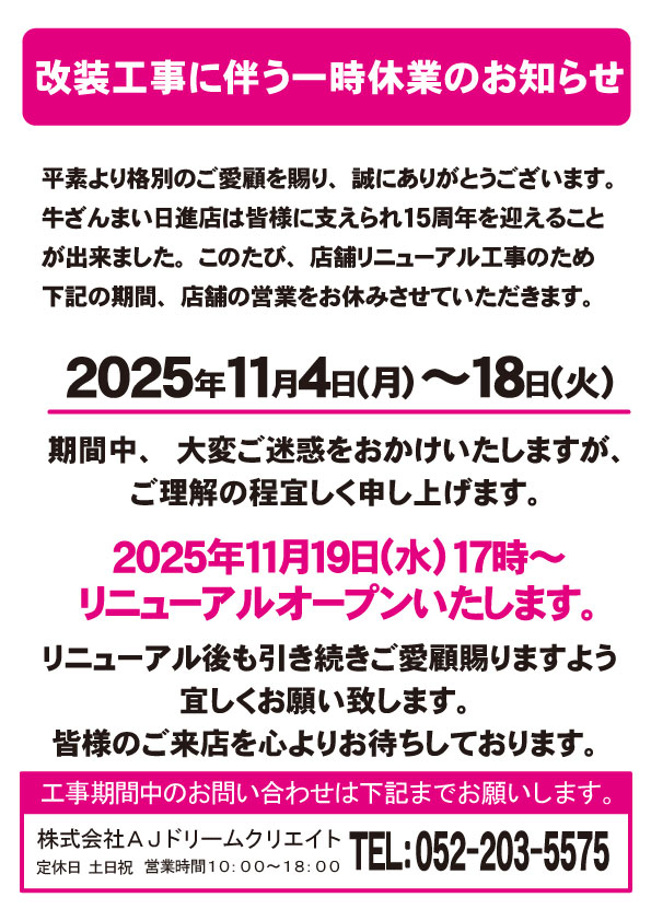 牛ざんまい日進店 改装工事に伴う閉店のお知らせ